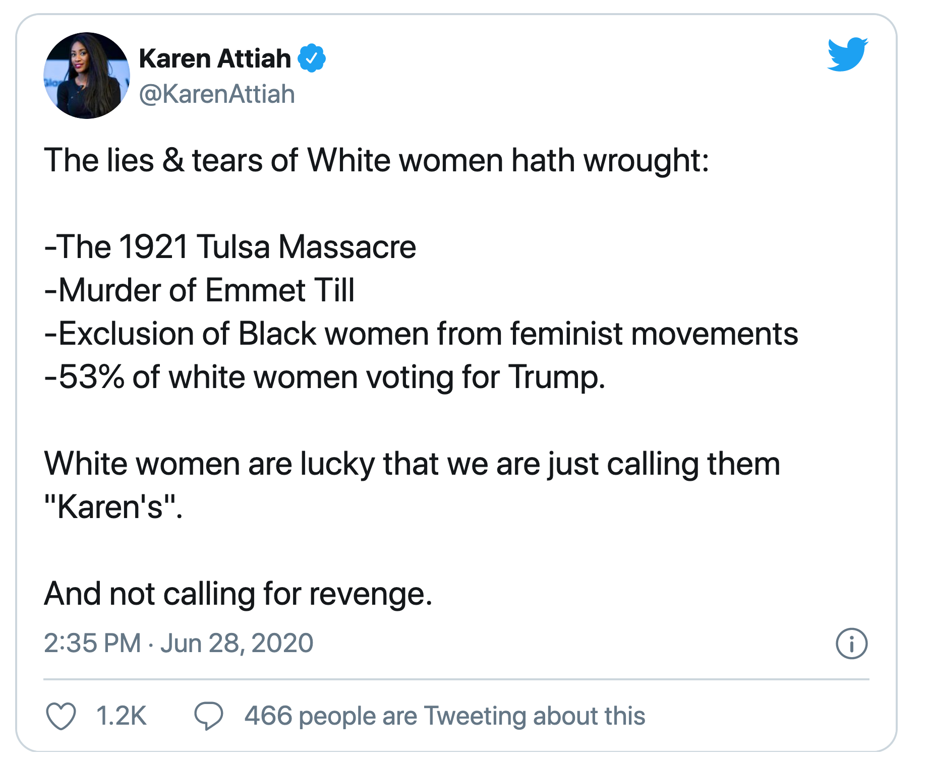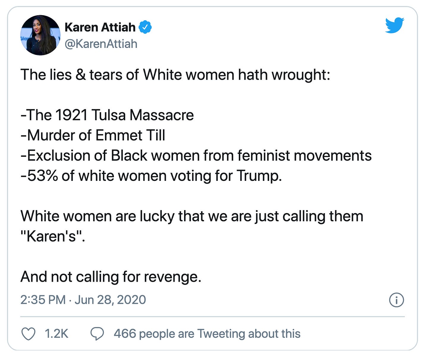 Or her revelation that calling white women a “Karen” or a “Becky” isn’t a racist slur because Emmett Till: