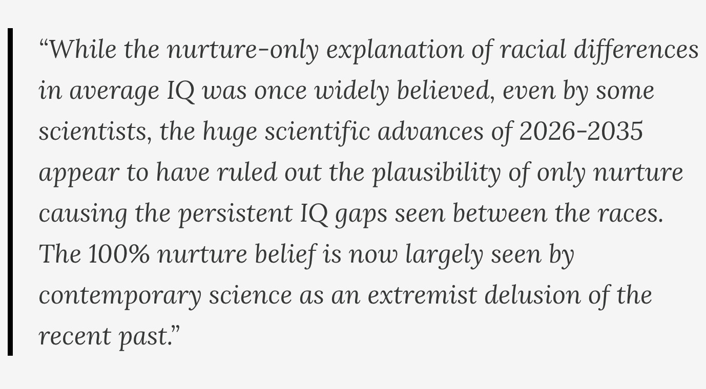 “While the nurture-only explanation of racial differences in average IQ was once widely believed, even by some scientists, the huge scientific advances of 2026-2035 appear to have ruled out the plausibility of only nurture causing the persistent IQ gaps seen between the races. The 100% nurture belief is now largely seen by contemporary science as an extremist delusion of the recent past.”