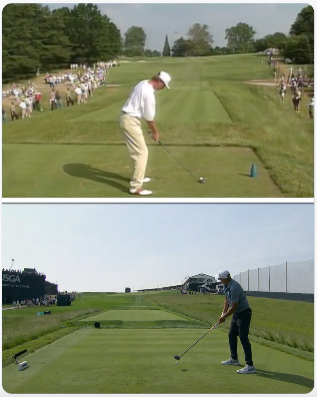 Gay Race Communism is not welcome at Oakmont. Yet, Oakmont has still undergone extreme shifts in golf fashion over the last 80 years, as can be seen in these views from the 17th tee in 1994 (top) and 2025 (bottom) from Jamie Kennedy: