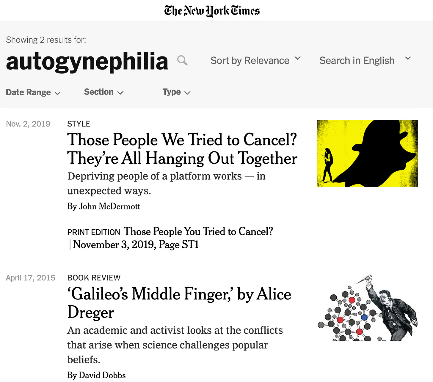 The New York Times, for instance, which traditionally determines what News Is Fit to Print for the rest of the prestige press, has still not mentioned the word “autogynephilia” in the 2020s: