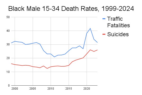 Seriously, this is an example of how the young black male suicide rate has gone up a lot in the last decade for reasons that nobody seems to understand.