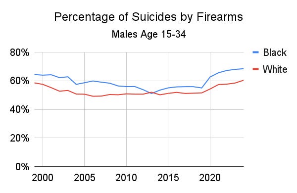 Back in 1999, the first year for which the CDC’s WONDER system of mortality statistics displays data, black males age 15-34 died by suicide 73% as white males of the same age. By 2015, the ratio was down to 53% as much.