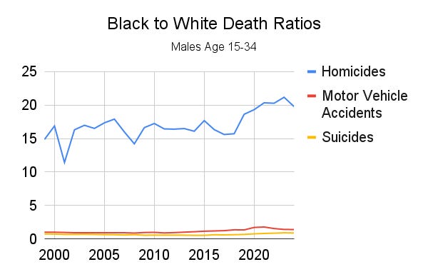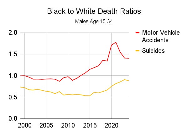 From 2012 on, young black men have had a traffic fatality problem relative to young white men, and the same for suicide from 2016 on.